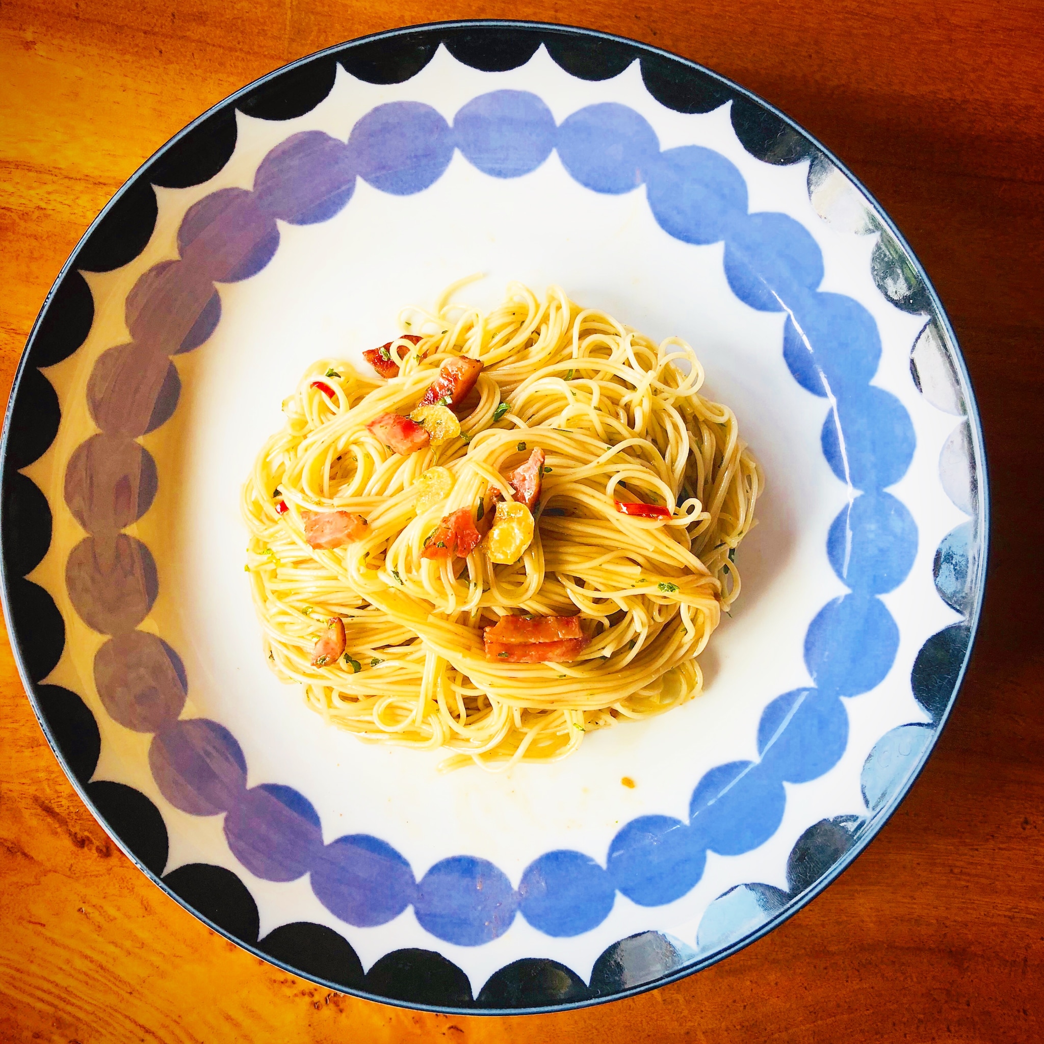 ④ ③に島原素麺とペペロンチーノの素を投入し、